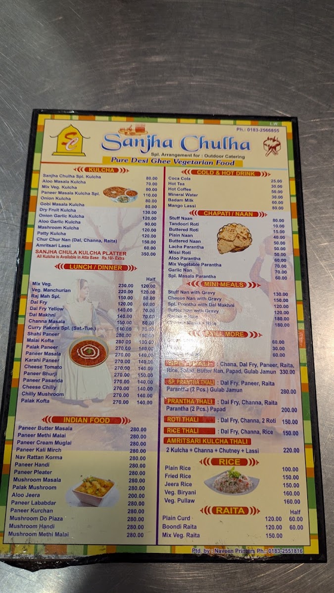 Introducing the menu at Sanjha Chulha, a hidden gem located on Lawrence Road, Amritsar, where traditional Punjabi cuisine meets comfortable dining. This restaurant is celebrated for its mini meals, featuring sumptuous options like Stuff Nan with Gravy and Cheese Nan with Gravy, all starting at just ₹130. The Indian food menu dazzles with a diverse selection of paneer dishes, each priced at ₹280, showcasing the restaurant's commitment to quality and flavor.